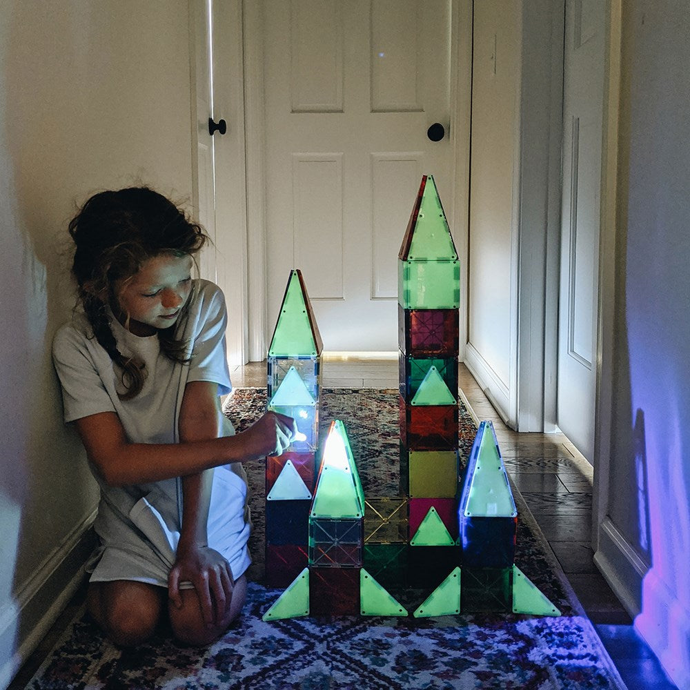 Creativity sparks in the dark with these unique Glow tiles! The fun doesn't stop when the lights go out. Now your kids' MAGNA-TILES creations can reach for the stars and come to life - in the dark! Explore STEAM concepts through fun experiments, unique learning activities and one-of-a-kind building possibilities! The MAGNA-TILES Glow 16-Piece Set is a great addition to your collection, enabling kids to come up with some truly unique creations. When they're done building, turn out the lights and reveal the glow! We’re all about STEAM learning and science truly shines with Glow. With the included LED keychain light, kids can supercharge these pieces or leave them in direct sunlight to activate the glow feature. The longer the tiles are exposed to light, the longer and brighter they shine! Parents and teachers alike have found dozens of unique and interesting ways to incorporate Glow tiles into fun science activities and lesson plans.